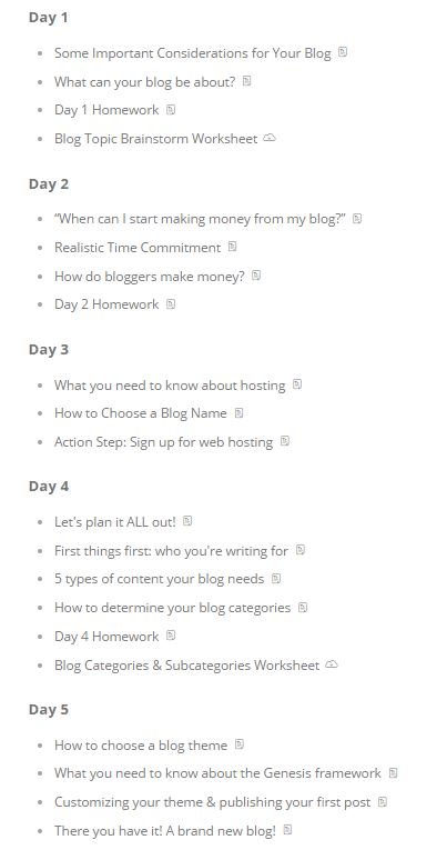在开一个博客训练营我们将讨论博客如何赚钱,如何选择一个博客的名字,如何确定你的博客类别,以及更多。基本上它会指导您完成前期规划你的博客的过程一直到一点当你开始起草你的第一篇文章。在这里,我们可以先看看目录: